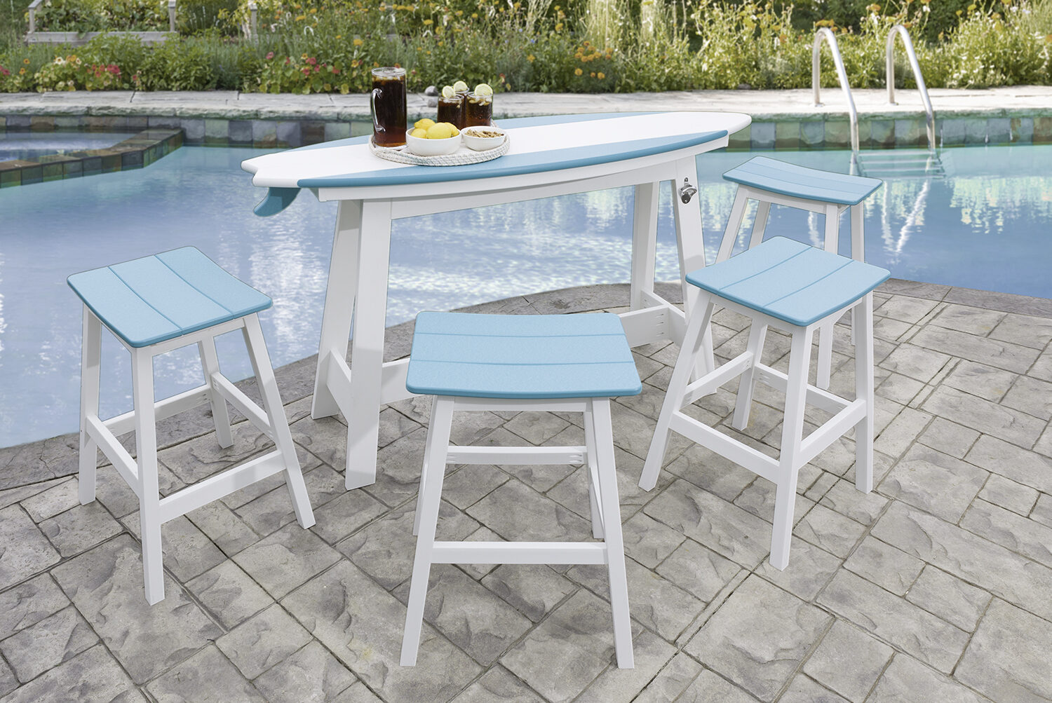 From bungalow to poolside, our eye-catching Surf Set amplifies the fun, warm-weather feeling of any outdoor space. The high table is perfect for enjoying casual meals, presenting snacks and bottles of cold drinks—especially with its built-in bottle opener.